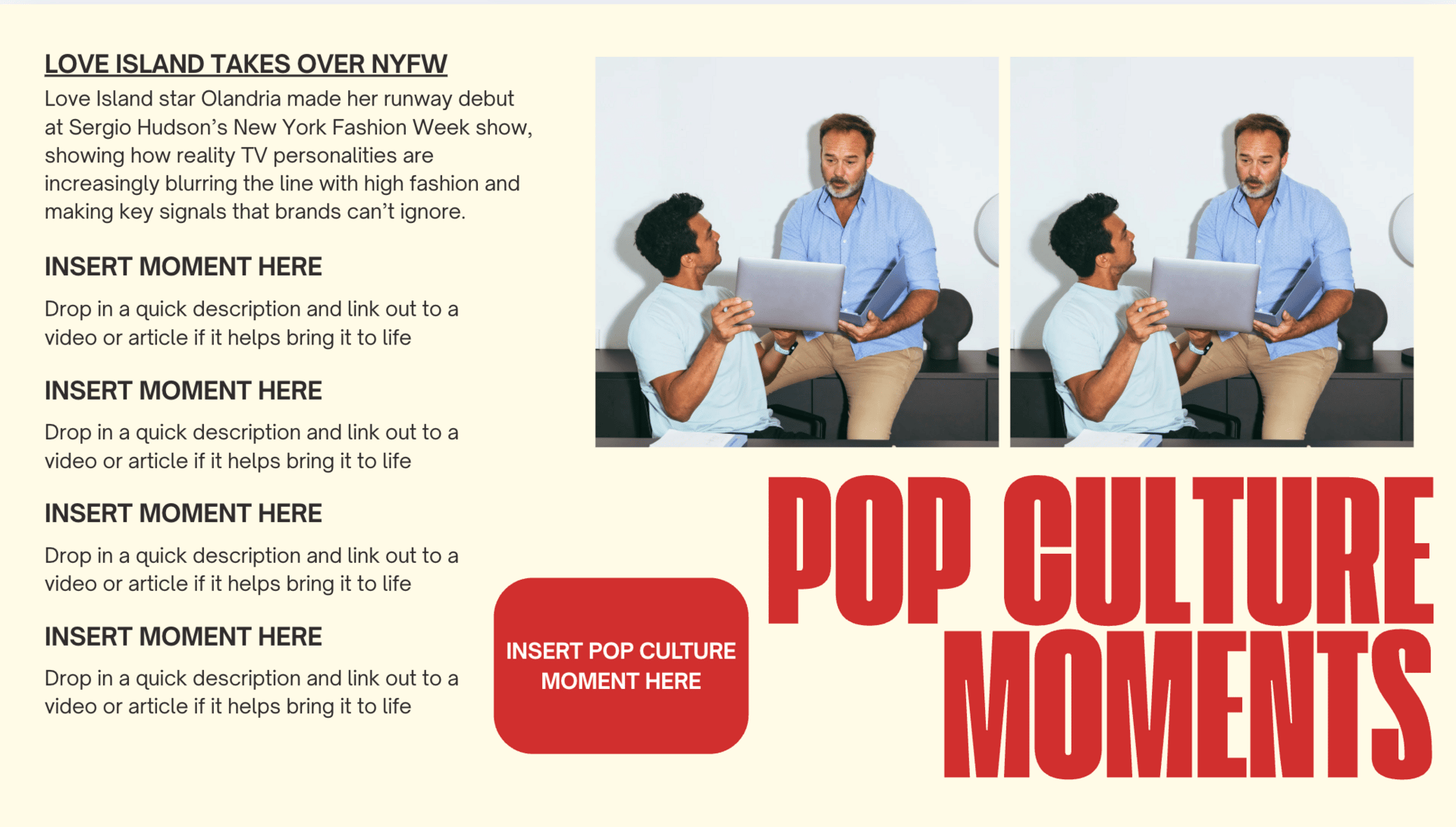 The big conversations happening in culture, media, or your industry. This is where you help your team decide where to have a point of view – and where to stay quiet.