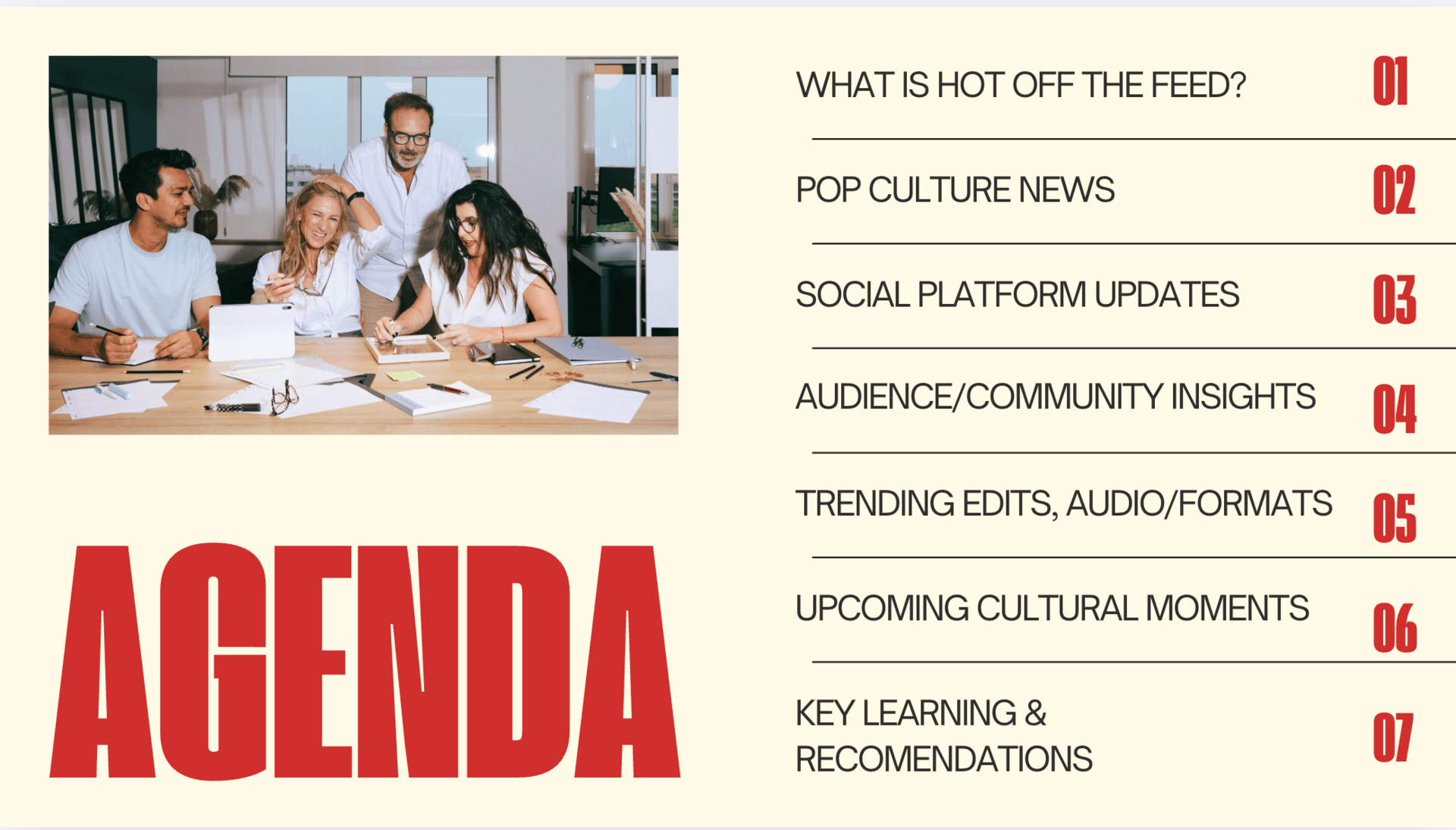 This is your "here's what you need to know this week" section. Platform updates, algorithm changes, viral moments, brand wins or fails, quick stats.